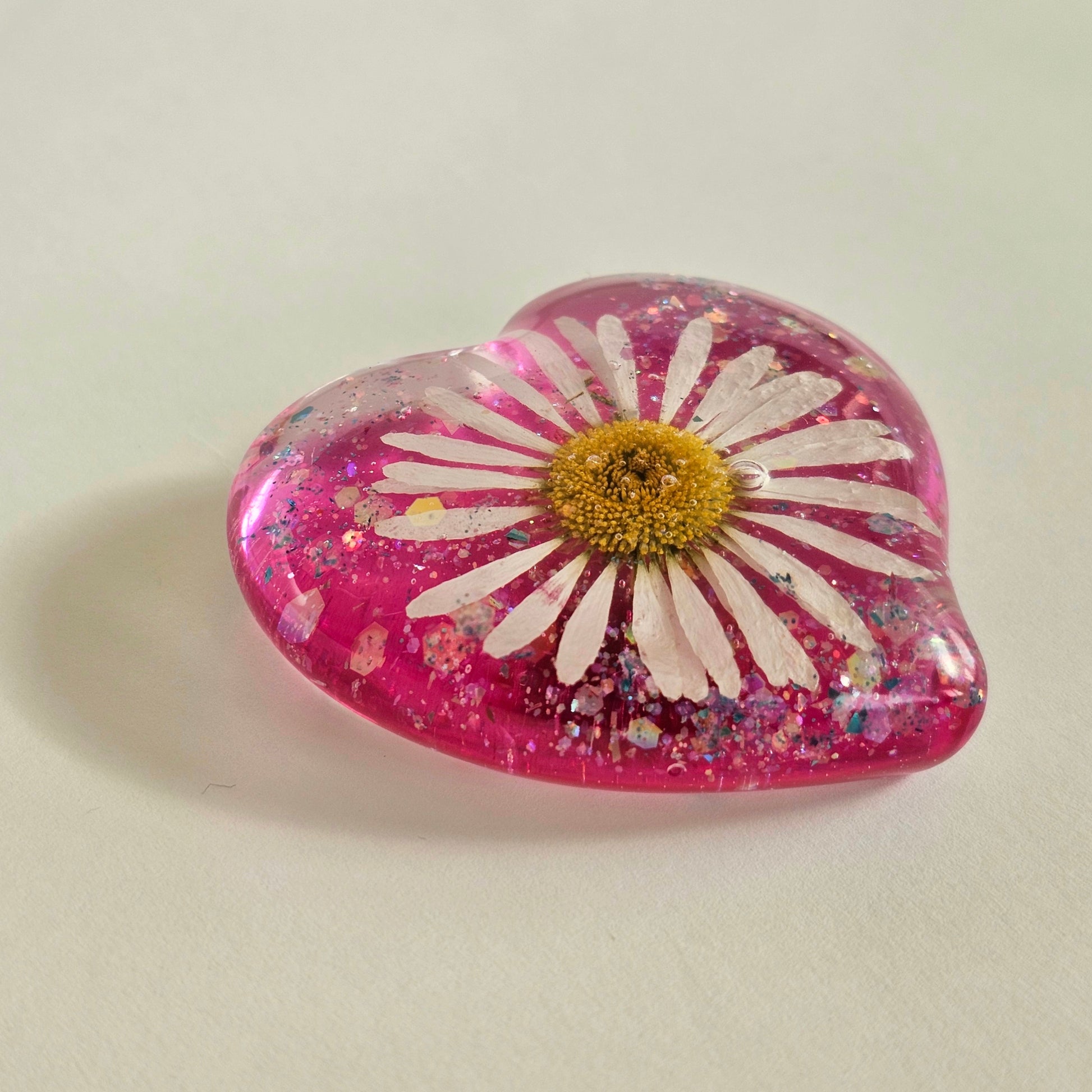 This heart-shaped charm features a real 3D dried daisy delicately preserved in crystal-clear, translucent resin. Accented with a pink magenta background and a shimmer of glitter, each piece feels like a little piece of cotton candy and flower frozen in a moment of joy.
