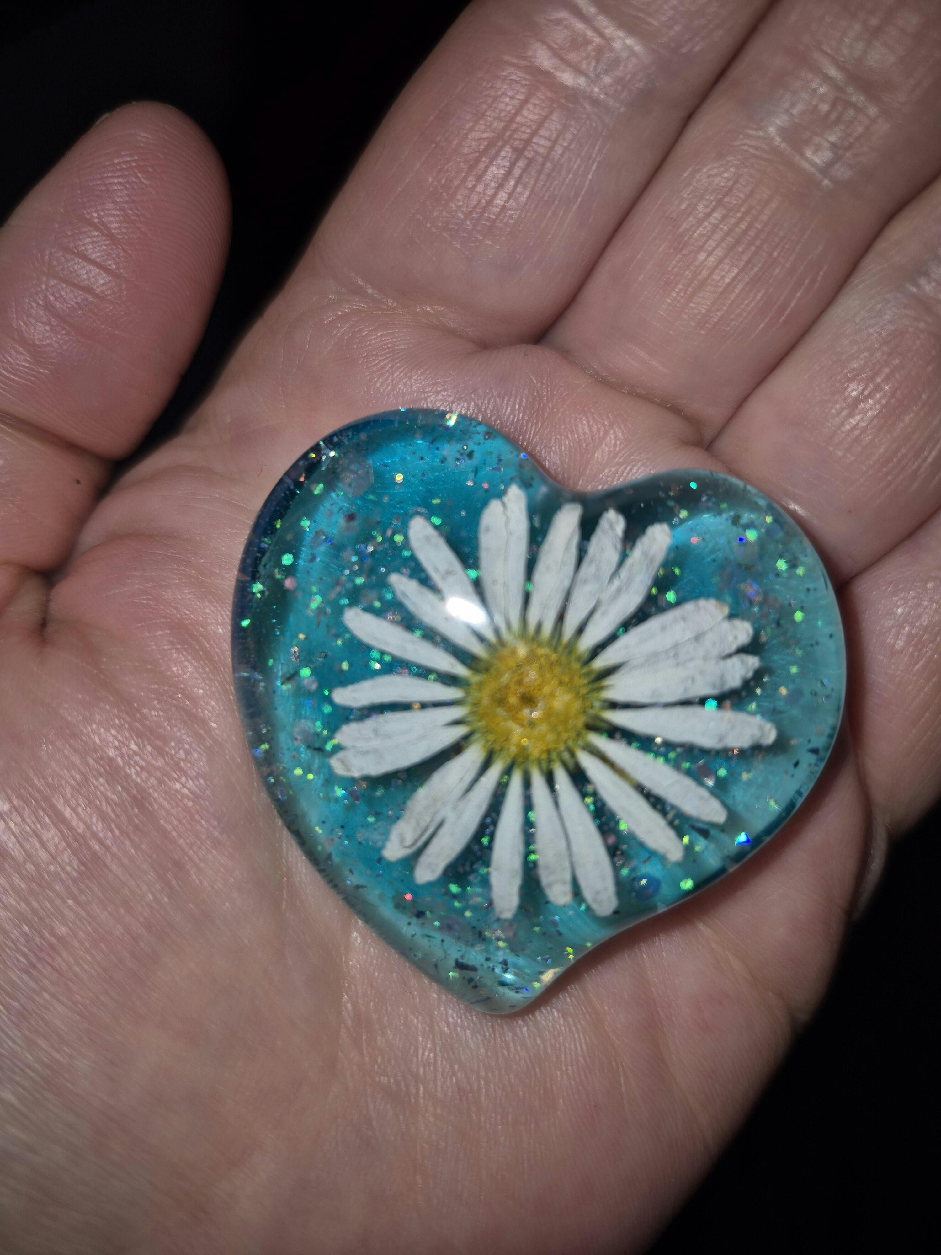 I ordered a resin daisy heart and it is so beautiful. The daisy is fully intact and the details are breathtaking. I love all of the little sparkles when the light or sun catches it. And it came in a stunning keepsake bag, which was a nice surprise. I will cherish both forever. The pictures on the website do not do justice to how beautiful the resin flowers are in person. This would make such a thoughtful Christmas, birthday, anniversary or any special occasion gift!